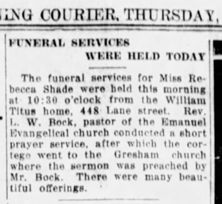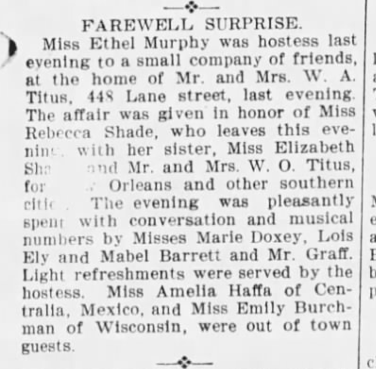 The year was 1912, and my great aunt Rebecca Shade was 22 years old; a few months earlier, her friends had held a farewell surprise party for her and her sister McClada, as they would soon be off to New Orleans.