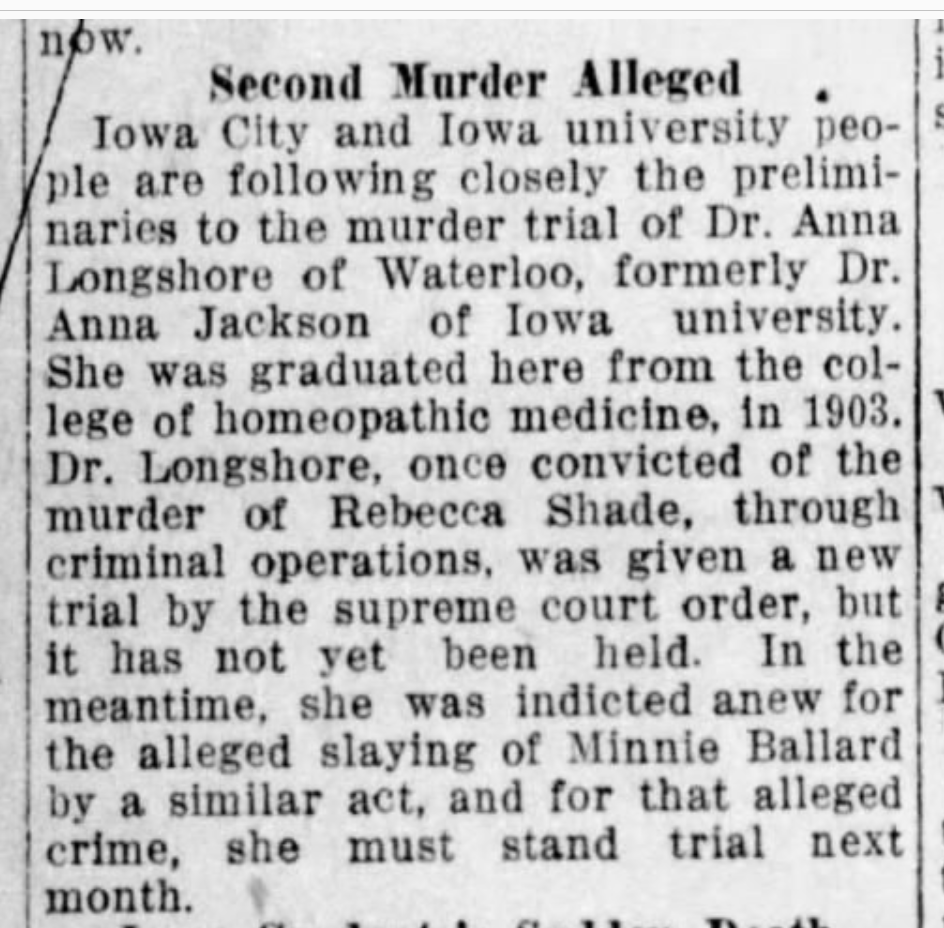 Dr. Jackson was tried and convicted of second-degree murder; she appealed to the supreme court. However, in the meantime, she was charged with the death of a 2nd girl, 14-year-old Minnie Ballard.