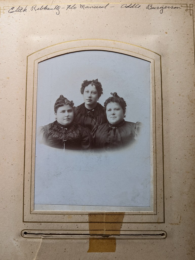 Believed to be Aurora Addie Waunch Burgeson (see her Wikitree Page), Edith Barbara Waunch Rebholz Nylander (see the WikiTree page for Edith, and Flora Etta Waunch Minard(see her WikiTree Page)