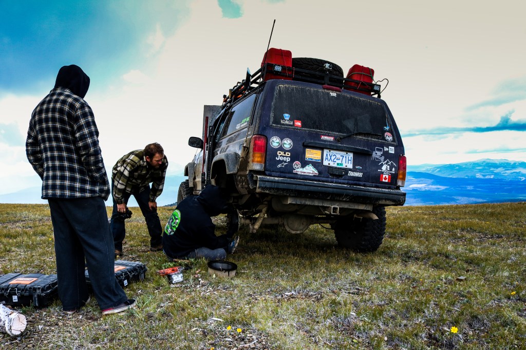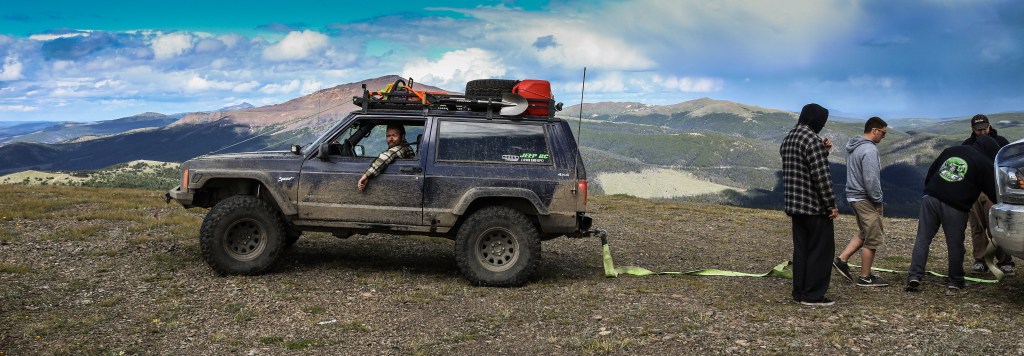 Jody stepped in, as he was always doing on trail runs for others. In that very brisk, chilling to the bone wind, he worked with the parts to McGuyver a solution that would allow a safe descend back down. As there was this desire to ensure there was no need to press that button on the SPOT, we then used tow straps to attach Shaun’s Jeep to the front of Tony’s truck.
