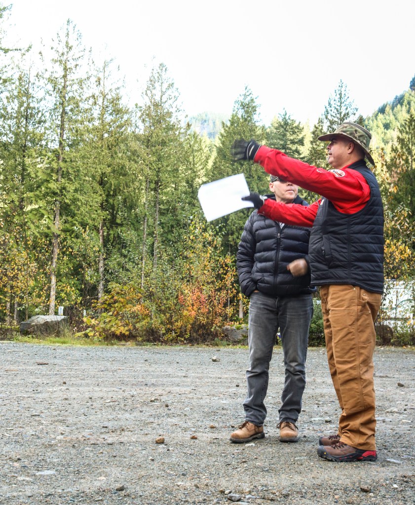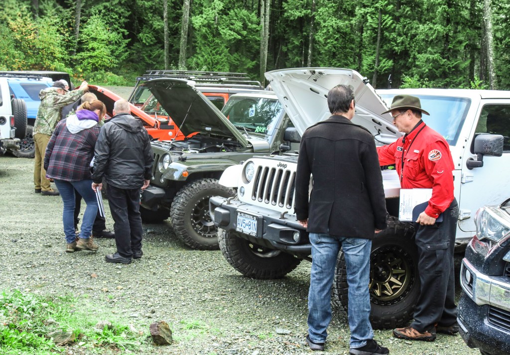 I heard Kim’s diesel pulling up outside my place and jumped in with my camera gear as we headed out to the Sasquatch to rendezvous with the students and other instructors. Matt was busy signing people in and handing out handheld VHF radios to assist with communication, while Mike noted everyone’s names on the rigs with his neon green marker. As the last person arrived, the group gathered, introductions were made, basic housekeeping rules were conveyed, and the agenda quickly ran through.