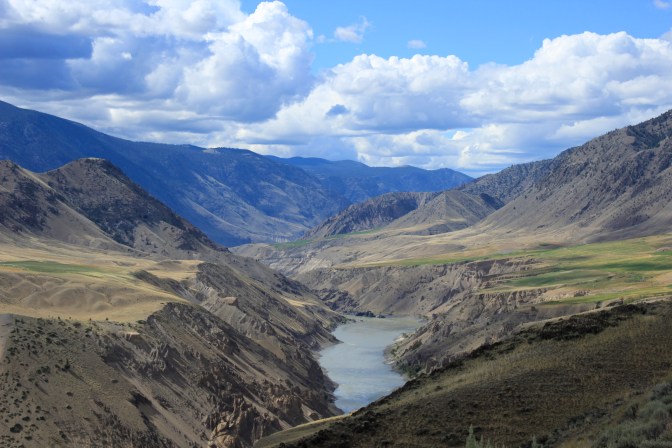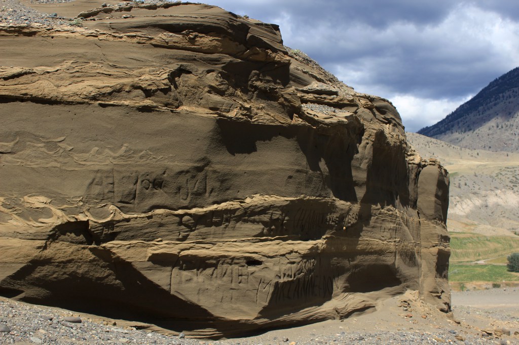 As I descended further along the trail, the gas gauge was getting closer and closer to empty, and shortly after the section with the forest fire, the gas light came on, and it was time to pull out the Jerry can and fill it up. I turned the jeep off, filled up with the one Jerry can and enjoyed the moment (again, strangely found myself giddy and giggling), then continued on my way down the road and came out to the main FSR. The scenery quickly changed to the beauty that the Chilcotins is well known for, the vistas and sandstone, and I had to make a decision if I was going to take the Big Bar Ferry back to Lillooet or to take this side of the river.