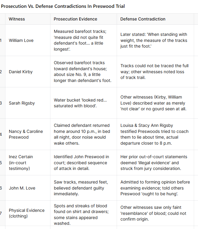 Preswood’s defence rested heavily on an alibi provided by his family. His father, John Preswood Sr., testified that John returned home from visiting the Rigsbys around 10 p.m., “went to bed in a few minutes… was at home all night… complaining of his head… if he had gone out the door, I would have heard it scrape on the puncheons.”