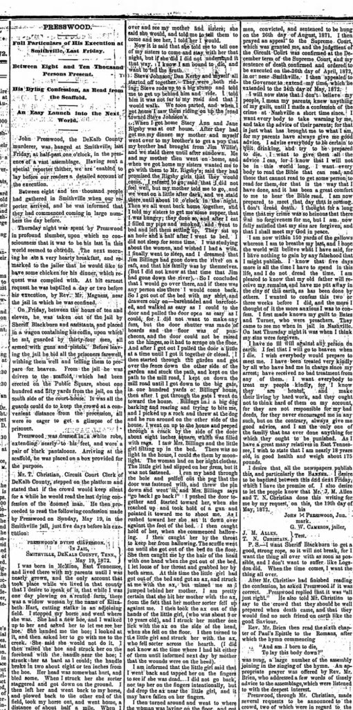 John Preswood was executed on May 24, 1872. Reverend Jerry W. Cullom preached at his funeral. The case left an enduring mark on local memory, not only for the violence of the crime but for the legal issues it raised—primarily the handling of hearsay, the competency of child witnesses, and the question of juror impartiality in a small rural community.