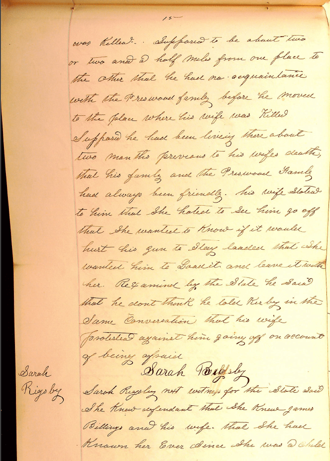 On Sunday night, January 29, 1871, Rachel Billings and her children were at home, about a quarter to half a mile from the Preswood residence. James Billings was away, working as a hireling on a rafting crew. The next morning, twelve-year-old Inez went for help. Neighbor Sarah Rigsby testified: