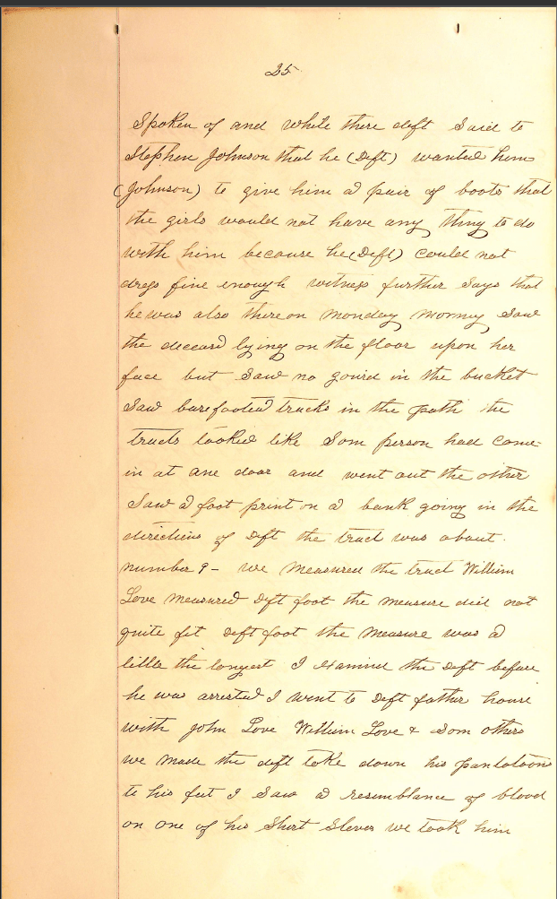 John Preswood… After your mother was knocked down did you see him lying down with her? Yes sir… She was groaning… He was barefooted… He washed his hands… in the water bucket.”